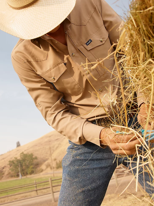 ta på det uventede i en av våre mest pålitelige skjorter. Wrangler Performance langermet solid snap-skjorte kommer med alt du trenger å ta på dagen, inkludert uv-beskyttelse mot solens skadelige stråler og en fukttransporterende finish for å holde deg tørr. Denne skjorten med klassisk passform er laget for uovertruffen ytelse og komfort, komplett med en ventilasjonsåpning bak for pusteevne. den har også den klassiske western-stilen du kjenner og elsker, inkludert spisse åk og full trykklås. du vil ha god plass til det du trenger mellom de doble brystlommene, en napoleon-stil lomme på venstre brystlomme, en dedikert blyantspor og en brillerens nederst. bruk denne ytelsesknappskjorten med favoritt-jeansen eller bruksbuksene dine for et formidabelt antrekk.