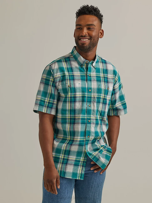 klær nei Wrangler menn robust slitasje kortermet lettstelt rutete button-down skjorte variabel blågrønn (112325890) 8V40345